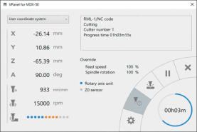 集成于設(shè)備單元前端的控制版面幾乎可以控制所有操作,用戶(hù)無(wú)需往返于電腦與設(shè)備之間。VPanel界面可與MDX-50無(wú)縫對(duì)接,方便用戶(hù)調(diào)整主軸轉(zhuǎn)速和速率。